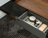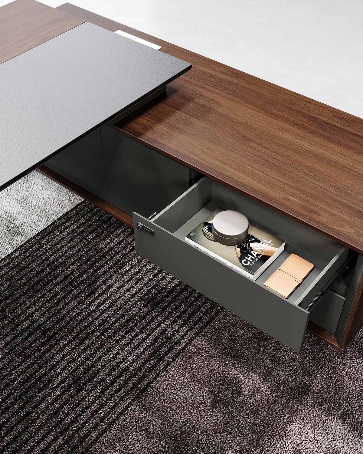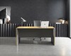 Составные, верхний слой меламин с кожаной вставкой на рабочей поверхности. Нижний слой скошенный под углом 45 градусов. Скрытый ящик высотой 6,5 см под столешницей можно использовать для хранения мелких предметов.